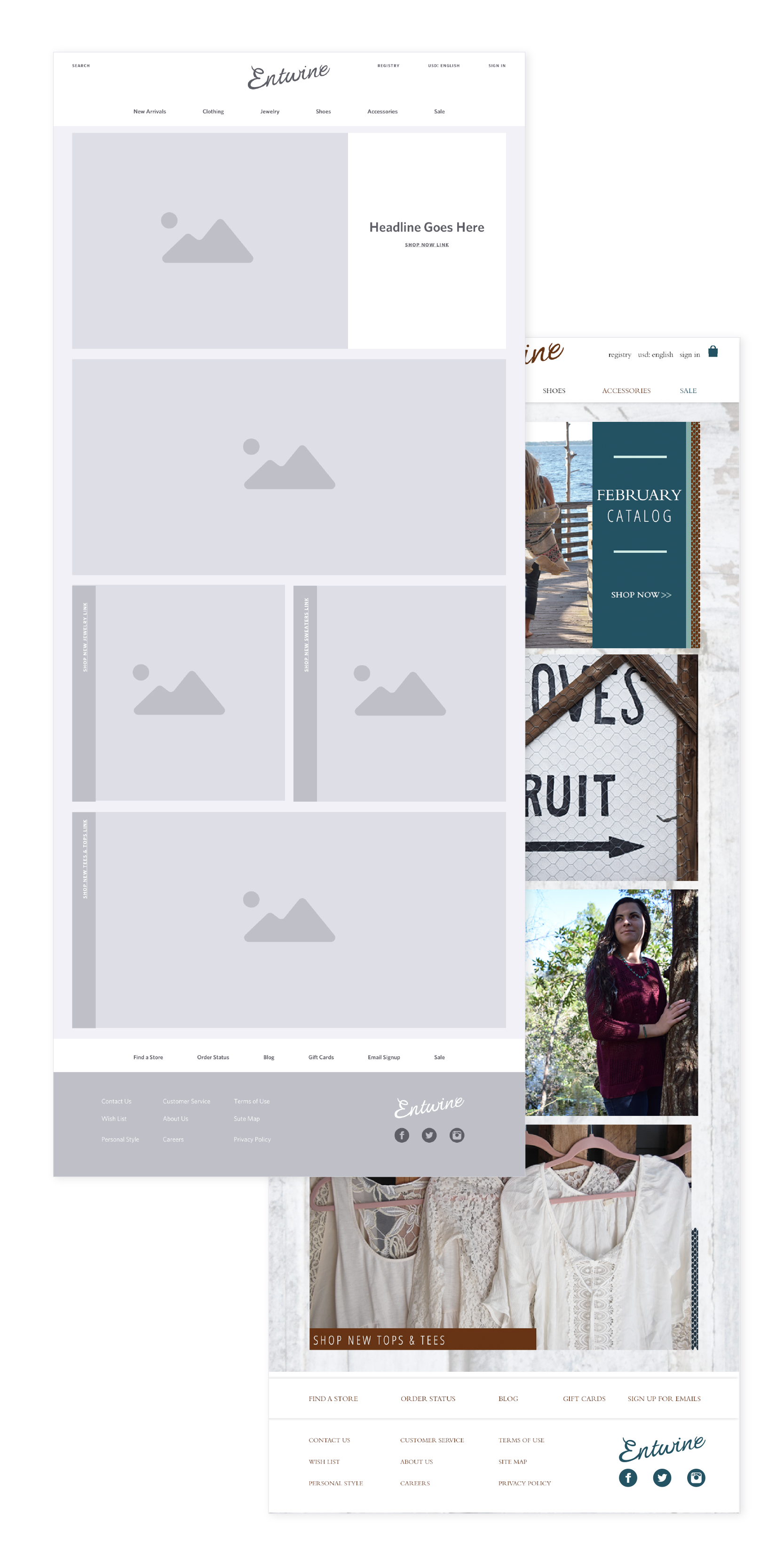 Entwine is a stylish, earthy, boho chic boutique that brings the west coast style to the east coast culture. The goal of the visual approach was to create a brand that is both elegant and down-to-earth, selling a sense of adventure and originality from the west. This is achieved by using script brown logo type that resembles the tone and intricacy of women in the world in which they live. The women shopping at Entwine are well traveled, aware, and urban minded hence the use of outdoor photography. The additional touch points bring together the overall aesthetic of the boutique and captures urban minded women in all their glory.
